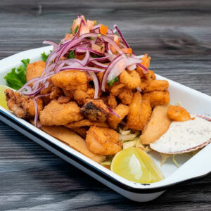 Una fiesta marina con mariscos de Paracas y filete de pescado crujiente, servidos con yuquitas, tártara y sarza criolla. 🌊🍤
