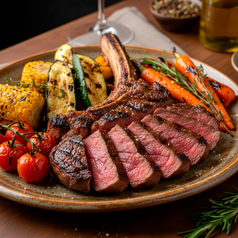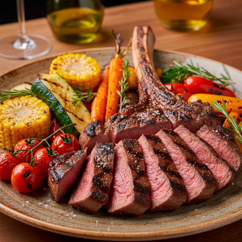 Una joya de la parrilla. Nuestro Tomahawk a la brasa se asa lentamente sobre carbón de algarrobo, logrando una corteza dorada y jugosa que despierta los sentidos. Perfecto para compartir (o no 😉), con guarniciones frescas y salsas de la casa.